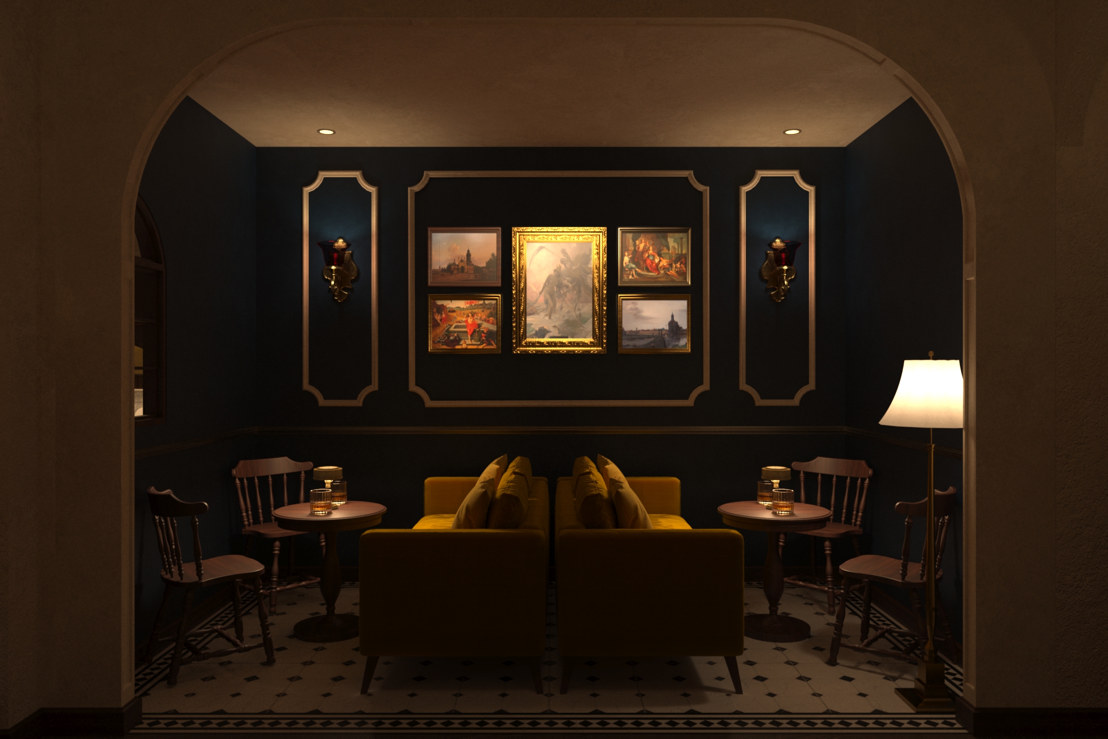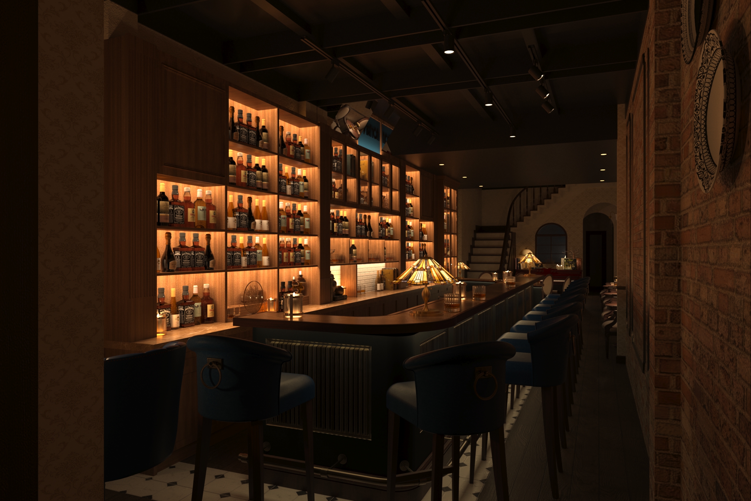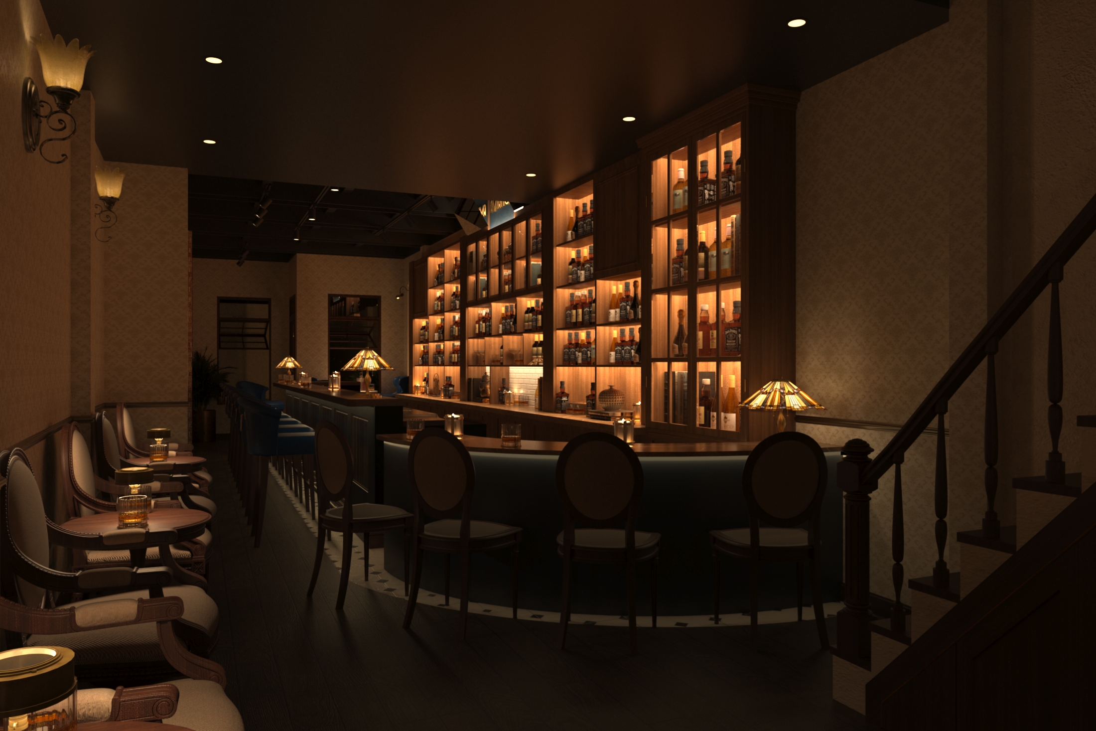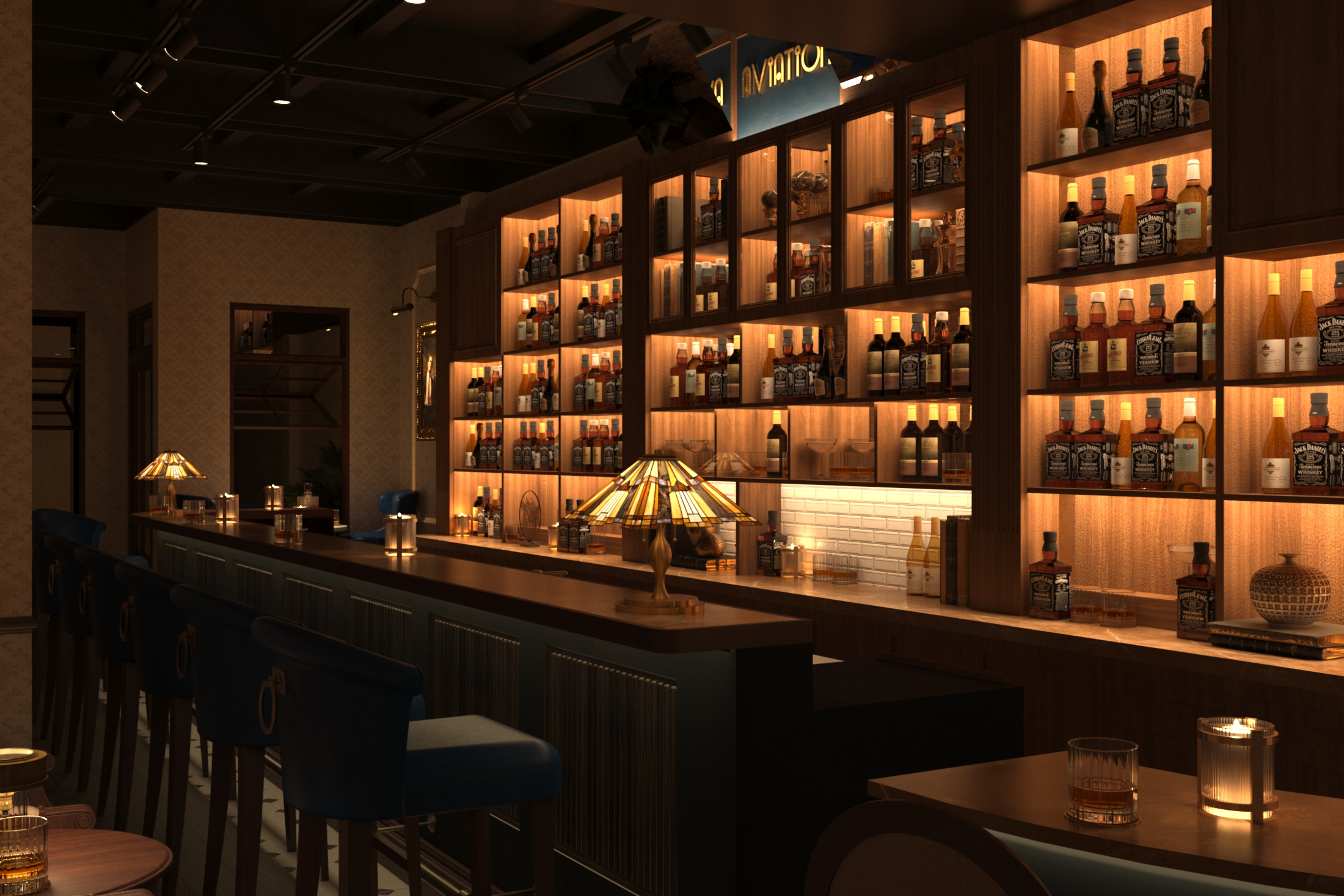 Description: The interior of a Aviation Bar typically exudes a timeless and elegant charm, inspired by traditional and luxurious design elements.